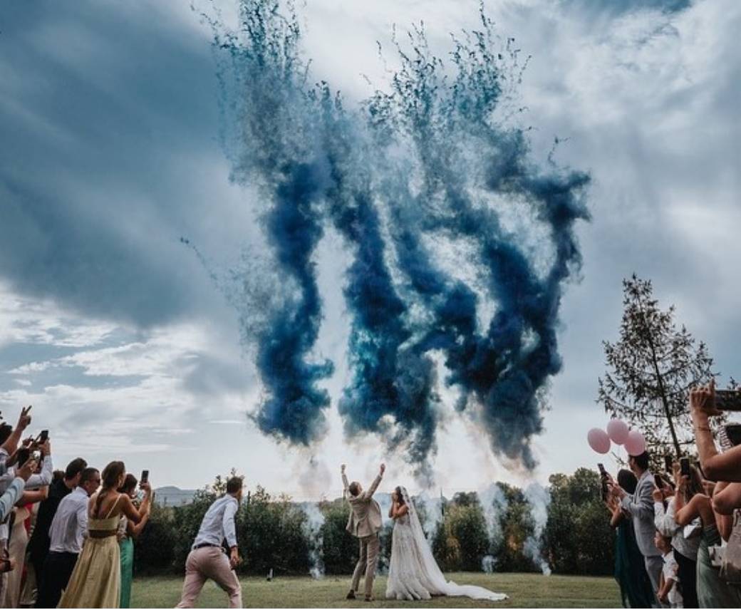A l’occasion de leur mariage célébré au Domaine Bastide&moi à Pourrières (83),nos mariés ont fait appel à nos services pour sublimer un moment de leur cérémonie à l’aide d’un dispositif composé de fusées de fumée colorée bleu.
